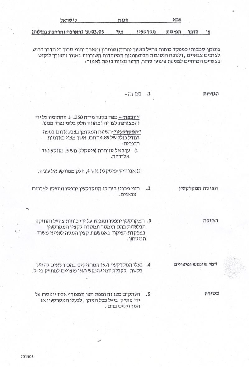 According to my authorities as a Military Chief Commander in the Region of Judea and Samaria, and as I believe that it is imperative for military reasons due to the special security situation in the region, I order the following: