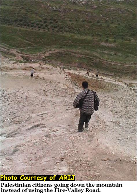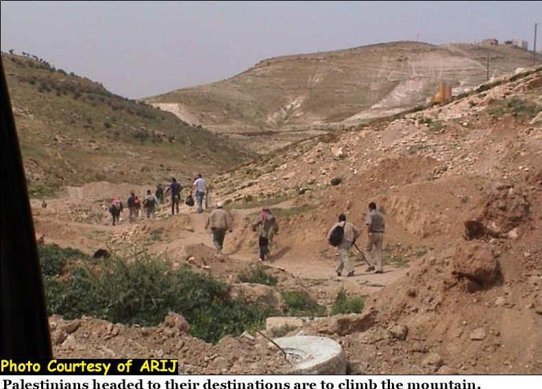 Palestinians could no longer bear such harsh measures and had to look for alternatives. The alternative was ''200-300'' meters high and dangerous hilly slope, about 1-1.5 kilometers distance which Palestinians found to sneak past the Israeli closure measures and to get their destinations. See photos of mountains. See Photo 1, Photo 2 & Photo 3,