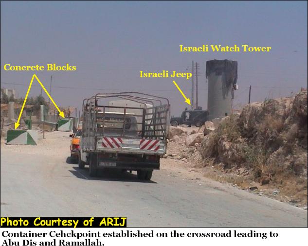 The 'Container checkpoint' is an Israeli checkpoint erected on the hill top of Qidron valley road (The Fire Valley Road) and blocks the entrance of As Sawahra Ash Sharqiya village. This checkpoint blocks the way and access in front of the Palestinians living in the southern Palestinians governorates (Bethlehem and Hebron) to the rest of the West Bank and vice versa. Before the second Intifada which erupted in late September 2000, the Israeli soldiers occasionally used to place a temporary checkpoint at the junction of As Sawahra As Sharqiya, check Palestinian IDs and then leave. This spot turned to become a permanent checkpoint constructed by the Israeli soldiers following the second Intifada to block the crossroad leading to As Sawahra Ash Sharqiya, Abu Dis, Ramallah and the northern Palestinian Governorates to make the daily life of thousands of Palestinians unbearable. Today, Palestinians must have travel permits in order to travel inside the West Bank issued by the Israeli authorities to be able to cross it.