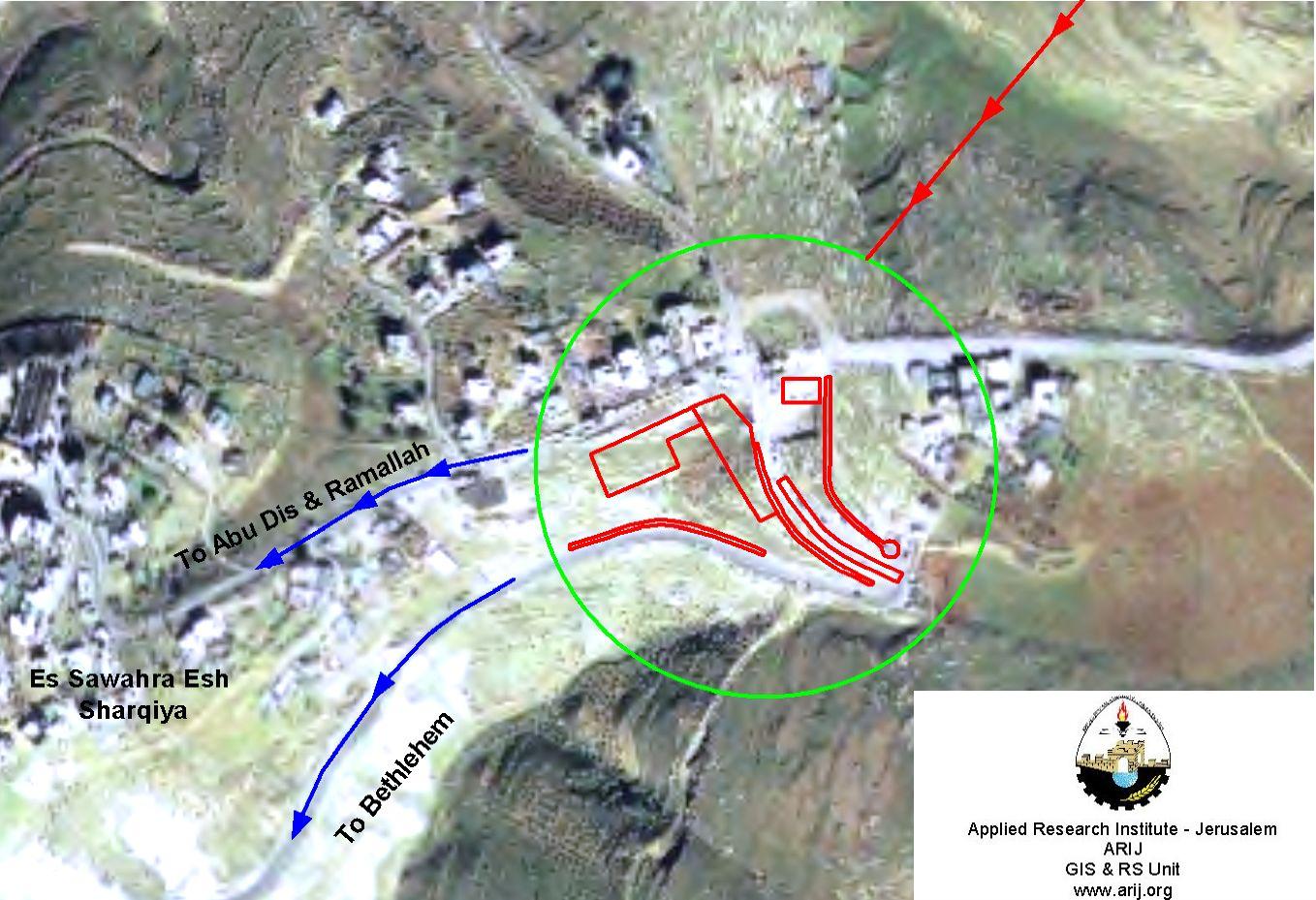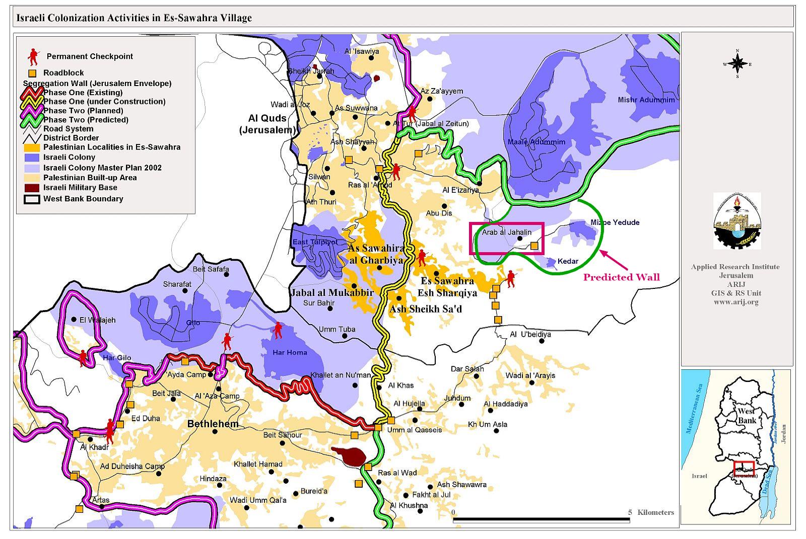 The analysis shows that a physical structure is expected to be built along the eastern areas of As Sawahra As Sharqiyia, to enfold and annex two more Israeli settlements, Kedar and Mizepi Yehude within the Segregation Wall which is currently being built on the expense of Palestinian lands. According to the analysis, a small Palestinian community called Arab Al Jahalin located to the east of As Sawahrah As Sharqiyia and houses a population of 1136, PCBS 2003, might be forced to evacuate the place as it will be isolated inside the 'projected Segregation Wall/Fence'. See map of projected Wall. click to see map below