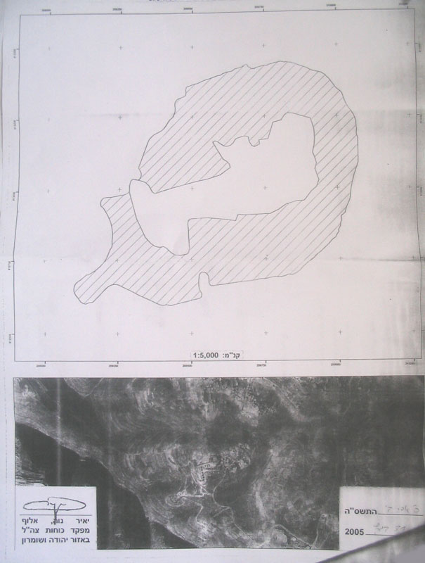 The second one carries the number of 04/05 (393), 5730 -1970, 5763 -2003 prohibiting Palestinian building in the target land for 'military and security purposes'. (The striped part appeared on the attached map is the no – building area, the white part is the current settlement built up area).