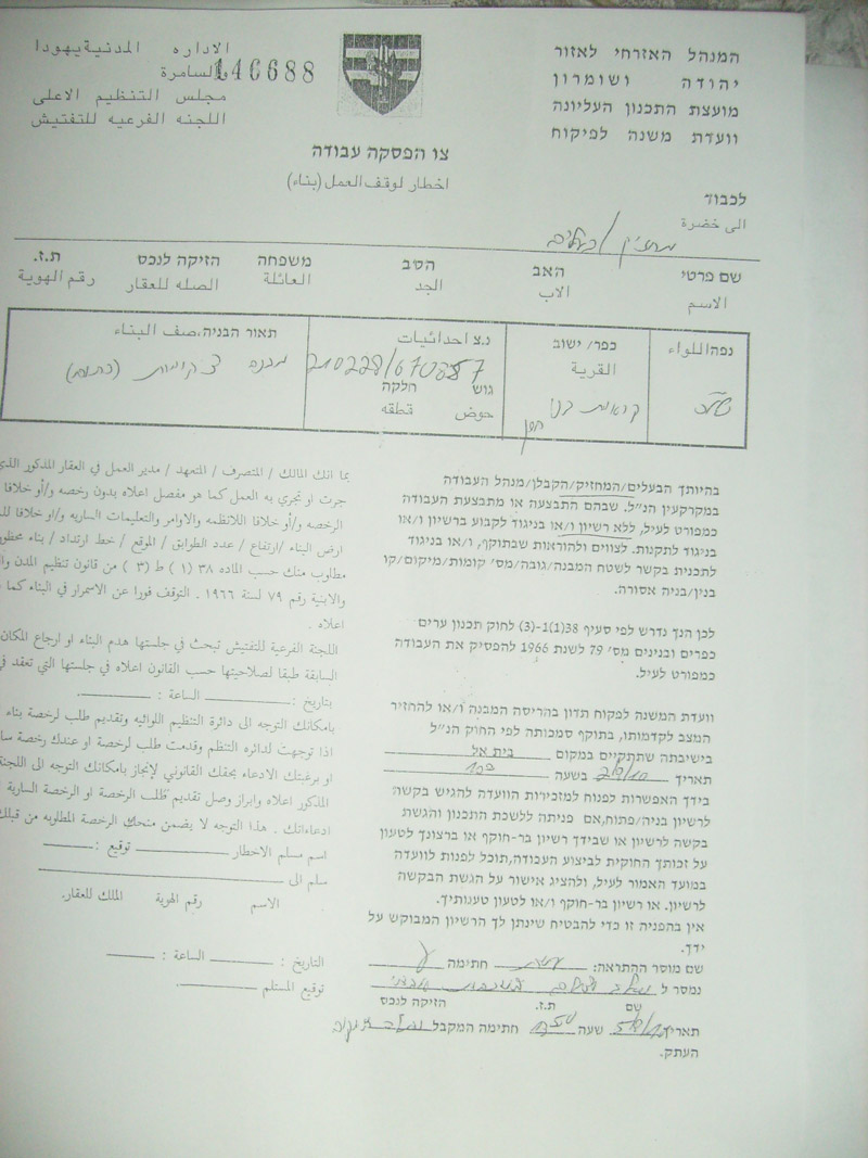 The notice was handed over to Mr. Hamamdeh’s neighbors on February 1, 2010 in the area of Khalet Rahila south of Yata. The house total surface area is 100 square meters and work began on it at the end of the last year. See Order 1