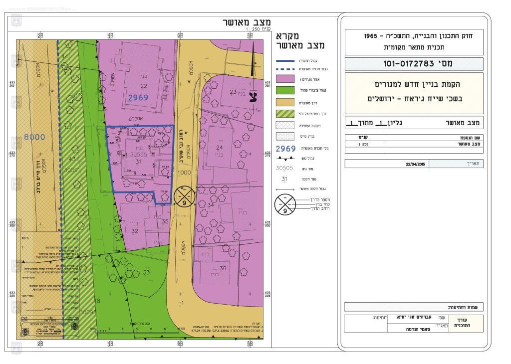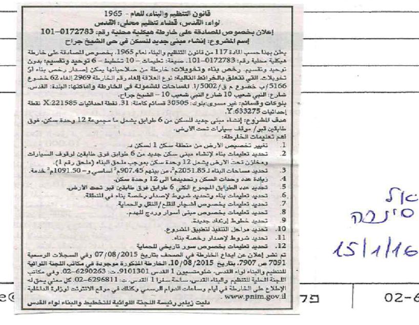 6. Plan No. 172783: on the 15th of January 2016, the Israeli Planning and Construction committee in the Israeli Municipality of Jerusalem published the approval on the plan scheme No: 101-0172783 to construct new housing building in Ash-Sheik Jarrah neighborhood. According to the plan a 6 story building with 12 housing units will be constructed on 2051.85 square meters of Land. The building will include underground parking and stores. See the photos below:
