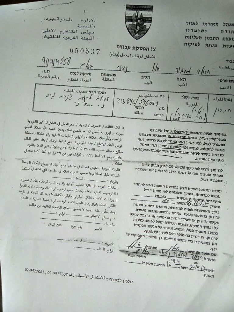 وجاء في الإخطار بأن العمل في المشروع تم دون ترخيص، وطالب بالتوقف فوراً عن العمل فيه، وحدد تاريخ 16/11/2017، موعداً لانعقاد جلسة لما يسمى باللجنة الفرعية للتفتيش، التي ستعقد جلستها بمقرها في مستعمرة " بيت ايل" وستناقش فيها ما وصفته " هدم البناء أو إرجاع المكان إلى حالته السابقة" وقد استهدفت سلطات الاحتلال المشروع الذي سيخدم ثلاث تجمعات سكانية، وهي: ( قرية البويب، قرية الديرات، قرية الرفاعية).