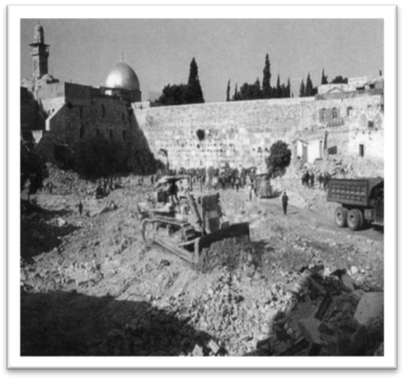 يذكر أن سلطات الاحتلال قامت بأعمال تغيير وطمس للمعالم العربية الواقعة عند حائط البراق، حيث قامت بهدم حارتي الشرف والمغاربة بشكل ومسحت آثار الحيّين من أجل إقامة ساحة كبيرة عند حائط البراق لكي تتسع لأعداد كبيرة من المستعمرين اليهود إضافة إلى كشف الحائط، كما قامت بهدم عدة مبان تاريخية بالمكان، وكان ذلك في يوم 11 حزيران 1967 حيث قامت قوات الاحتلال الإسرائيلي بطرد كافة أهالي حي الشرف الفلسطينيين بعد فرض حظر التجوال عليهم …. وأفرغت الحي من ساكنيه وقامت بهدم 125 منزلاً ومخزناً ومحلاً تجارياً ومقامات دينية وبالإضافة إلى مسجدين ( جامع البراق وجامع الأفضلية)، حيث استمرت أعمال الهدم التي قادها القائد العسكري الإسرائيلي آنذاك ( شلومو لاهط) لمدة ثلاثة أيام 11+12+13 / حزيران /1967 وقد كشف ضابط في سلاح الهندسة الإسرائيلي آنذاك ( ايتان موشيه) في مذكراته (( أن المنازل هدمت على رؤوس أصحابها الذين رفضوا مغادرتها ودفنت جثثهم تحت الأنقاض (تحت ساحة المبكى الحالية) – فيما نقلت ثلاثة جثث أخرى إلى مستشفى بكورحوليم في القدس الغربية عرفت منها اسم امرأة فلسطينية (رسمية علي طبعكي). وقد تم ترحيل حوالي 134 أسرة فلسطينية في أول عملية تطهير عرقي تحدث بعيد احتلال سنة 1967)). [1]