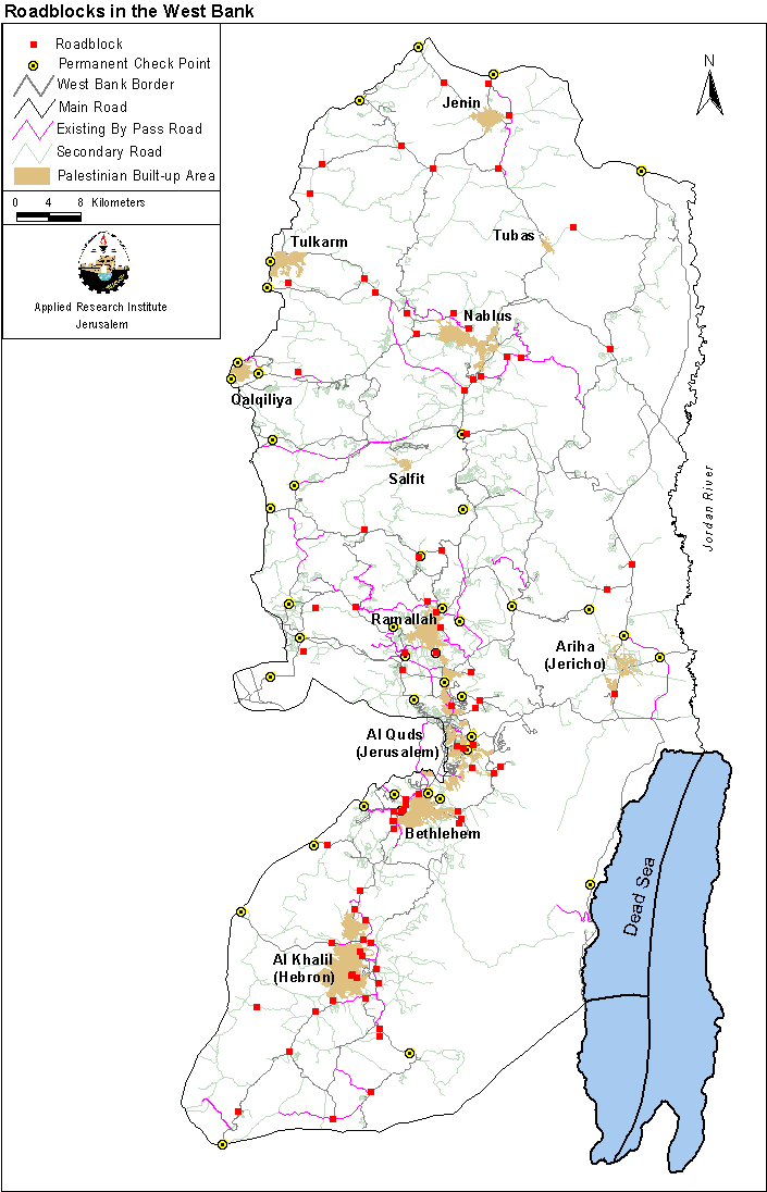 More recently, and in the wake of the Al-Aqsa intifada, Israel put checkpoints all over the West Bank in order to 'contain' the Palestinians. Ostensibly, these checkpoints were placed to provide settlers and Israeli vehicles with safe passages while travelling in the West Bank. However these checkpoints have encircled Palestinian towns to the point of suffocation; see map . The sieges have affected basic supplies of food and fuel in some areas of the West Bank especially those that are isolated or have tight Israeli control around them; see case study . Moreover the daily life of ordinary Palestinians was also disrupted by the fact that traveling within the West Bank became severely restricted and hence people could not reach their places of employment; see case study. All that was in order to ensure the safety of over 350000 Jewish settlers residing in the West Bank.