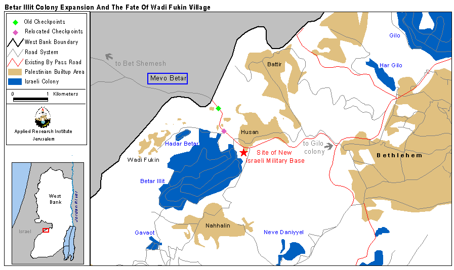 In the far western part of Bethlehem district there are three Palestinian villages, Husan, Wadi Fukin and Nahhalin. In between these three villages two ''Betar Settlements'' have been built, Hadar Betar and Betar Illit. There are currently more than 11,000 settlers in Betar Illit. Close by on the other side of the 1949 Armistice line there is the Israeli town of Mevo Betar. The close location of Hadar Betar and Betar Illit to the 1949 Armistice Line and their proximity to the Israeli town Mevo Betar on the other side of the line make these settlements likely targets for formal annexation to Israel in the future; see photo. Separation plans released by the Barak administration mark the area between Betar Illit and the West Bank border for annexation; see map. This case study takes a look at the changes being made west of Bethlehem that suggest the existence of plans for separation.