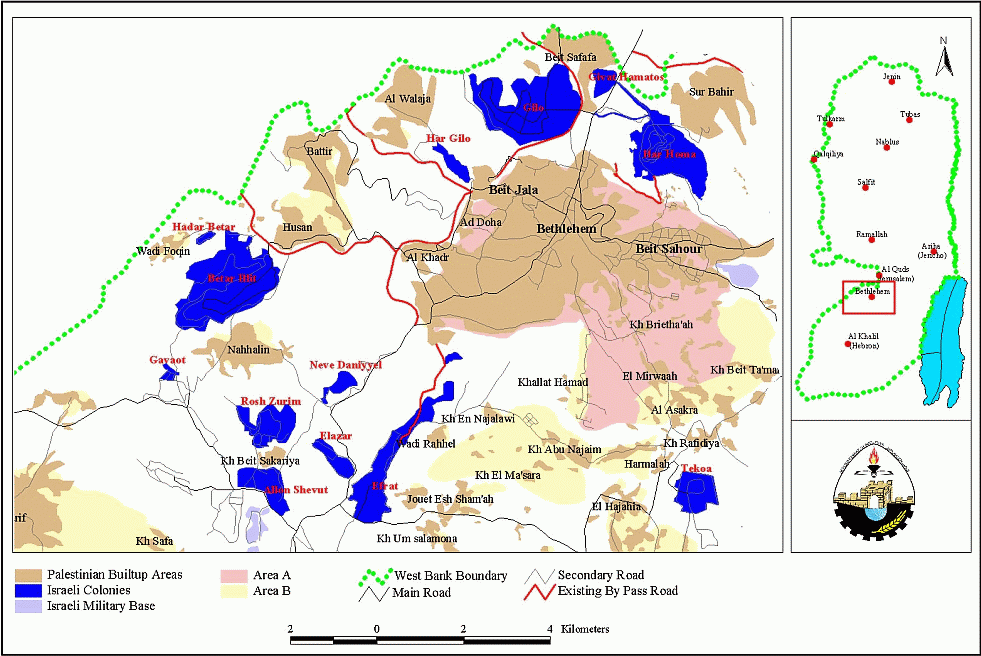 The Israeli authorities are using the same strategies extensively in order to secure control over East Jerusalem and its environs. For example, south of Jerusalem bypass roads have been constructed around the Gush Etzion settlement block, separating it from the heavily populated Palestinian area of Bethlehem. The annexation of the Gush Etzion settlement block would involve the absorption of several Palestinian villages; see map 2.