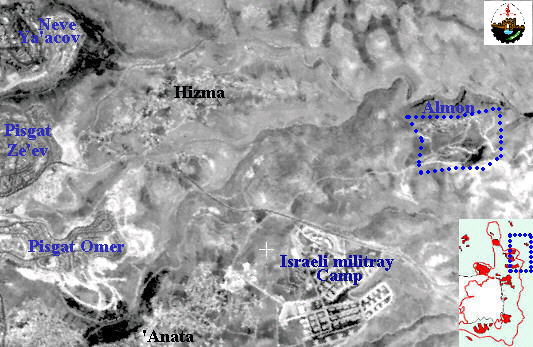 'Almon colony is a small colony which was established in January 1982 east of 'Anata village (Figure 26). The population of this colony is approximately 530 people of secular Jews. The colony blocks the road to a Latin monastery and the Ein Farah natural spring which used to supply Jerusalem with drinking water prior to 1967. Israel recently confiscated around 383 acres of 'Anata village land and designated them for the expansion of 'Almon, thus connecting it with the colonies of Neve Ya'acov and Pisgat Ze'ev, such expansion, combined with the expansion of the French Hill, Pisgat Omer and Pisgat Ze'ev, will strangle 'Anta village and eliminate any potential for expansion to absorb population growth.