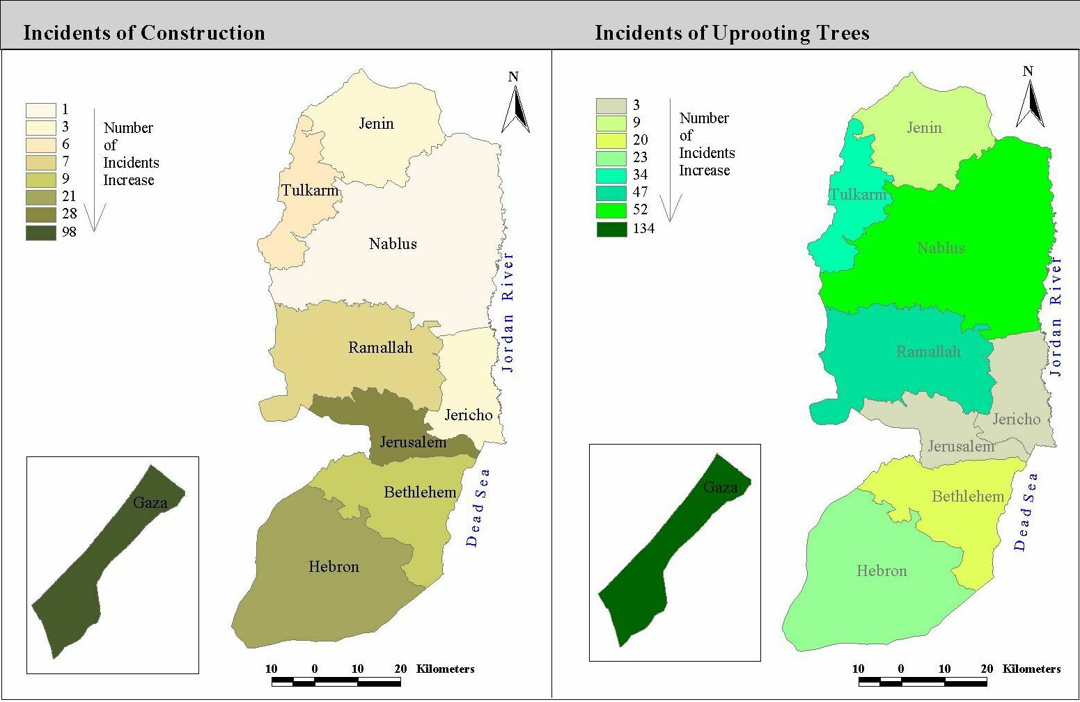 In the West Bank 270 of the 745 incidents (40%) were carried out by settlers. In the Gaza Strip, settlers were responsible for 27 out of the 335 incidents (8%).