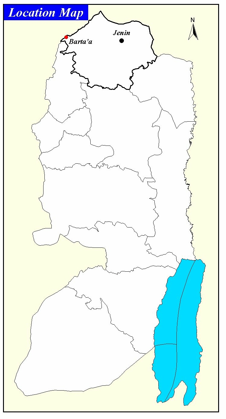 The village of Barta'a is located to the north of Jenin district in the West Bank. After the war that broke out between the Arab countries and the Jews and the creation of the state of Israel in 1948 the village of Barta'a was divided into two parts East and West because of its location at the border of the green line. West Barta'a is under the Israeli sovereignty and its people are having Israeli ID's , while East Barta'a is in the occupied Palestinian territories of area ''C'' and the people are having Palestinian ID's. See Map 1.