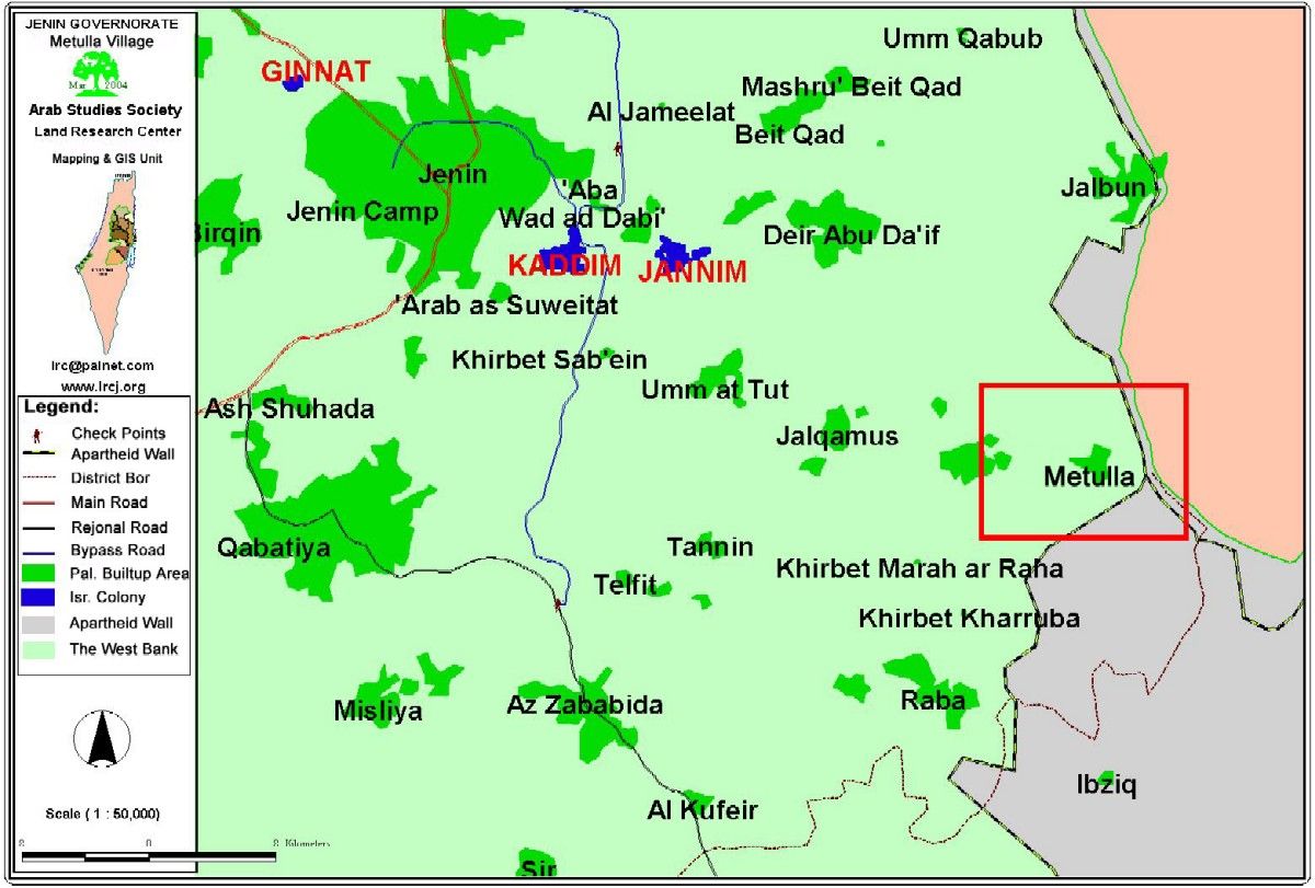 The small village of Metulla is located 14 km to the east of the city of Jenin. The village population is estimated at 300 people. The whole population is derived from the same extended family of Al Bazur. Most people in the village work as animal breeders and shepherds. Some work in agriculture and as laborers in Israel. The total number of sheep and goats in the village is estimated at 1000. There is a basic school, mosque and electricity network in the village. The village inhabitants live a very simple way of life. See map of location