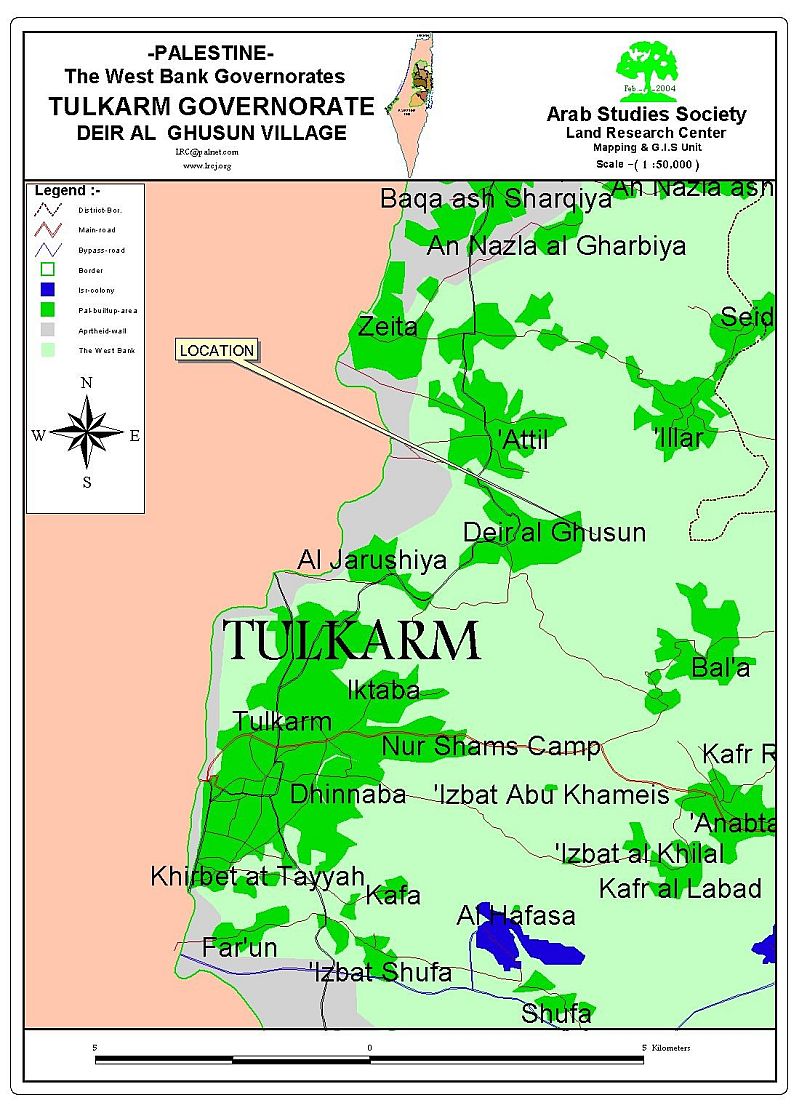 Deir Al Ghusun, a Palestinian town located 8 km to the north of Tulkarem city. It houses a population of 10000 inhabitants and is comprised of the following five big families: Badran, Ghanem, Khader, Qub and Omer. It is one of the biggest agricultural towns in the area with a plateau not less than 1000 dunums, most of which is covered with green houses and producing the largest quantity of Vegetables in the area. In addition, the town produces about 60000 can of pure olive oil per year. See Map of location