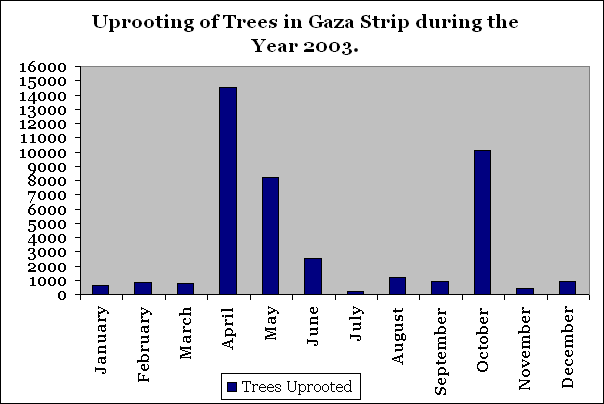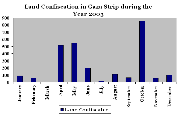 In the year 2003, Gaza trip has witnessed harsh Israeli measures starting from levelling and razing of lands and ending up with uprooting of thousands of Citrus and other fruitful trees conducted under many pretexts of which security was the most. The table below shows the Israeli violations including land confiscation and uprooting of trees during the year 2003 in Gaza Strip.