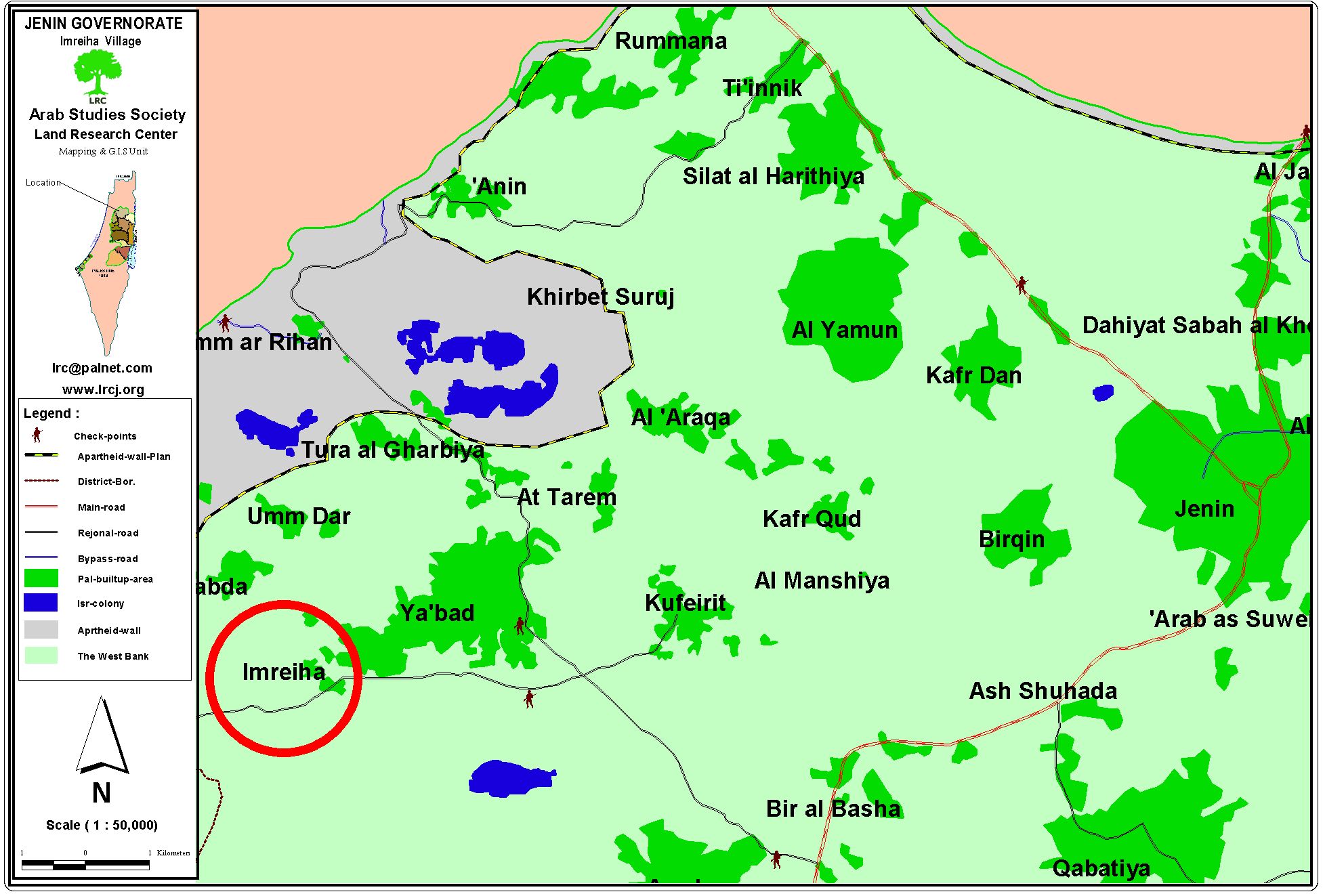 The village of Imreha is located 24 km to the west of Jenin city. It is bordered by the Palestinian villages of Ya'bad (north east), Kurf Ra'I (south) Ikfiret (east) and Baqa Ash Sharqiya (west). The village houses a population of about 500 persons (65 nucleus families) and they are all related to the families of Hamdoni and Turkman. The village is surrounded by the following Israeli colonies: