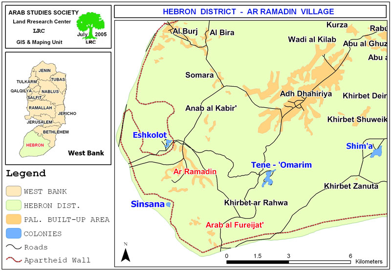 Initial maps of the Segregation Wall path in the West Bank circulated by the Israeli army showed that Ar Ramadin and Arab Al Fureijat would be totally separated behind the Wall. However, on February 20th, 2005, and as a result of continuous protests, legal actions and international pressure, a new Wall map was circulated according to which many Palestinian built up areas were excluded from separation, including Ar Ramadin and Arab Al Fureijat.