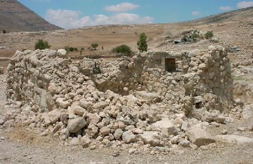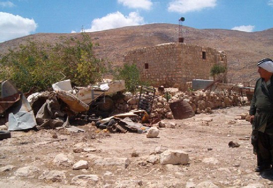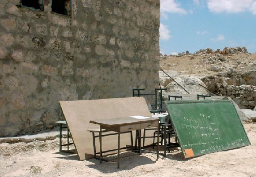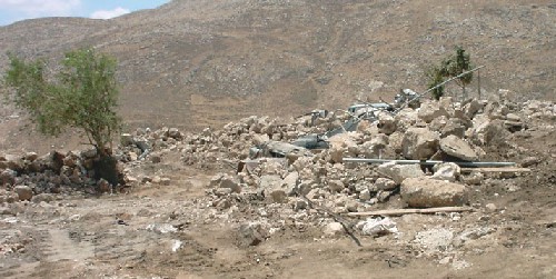 On July 5th, 2005, a large Israeli army force comprised of about 35 jeeps supported by bulldozers stormed Khirbet Tana and started the demolition process of a school, 14 residential barracks, 18 animal barracks and sheds, six animal fodder stores as well as two cisterns under the pretext of un-licensing. The total area of those demolished structures is 2159 square meters (2.159 dunums). During this operation, more than 50 dunums of grazing fields were also burned by the attacking Israeli force, see photo 1 and table 1 below   and table 1 below