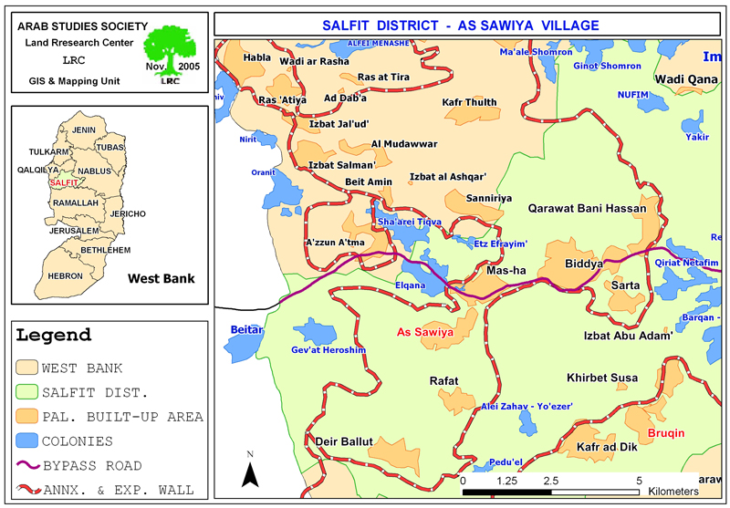 The village of Az Zawiya is located 15 km to the west of Salfit city in Salfit governorate. It has a population of about 4000 people, mostly dependent on agriculture and animal breeding as main income. The village's remaining area is 12669.5 dunum as it lost thousands of dunums to Israel during the 1948 war. Of the afore-mentioned area, there is 906.6 dunums built up area, in addition to other hundreds of dunums that have been separated behind the Wall.
