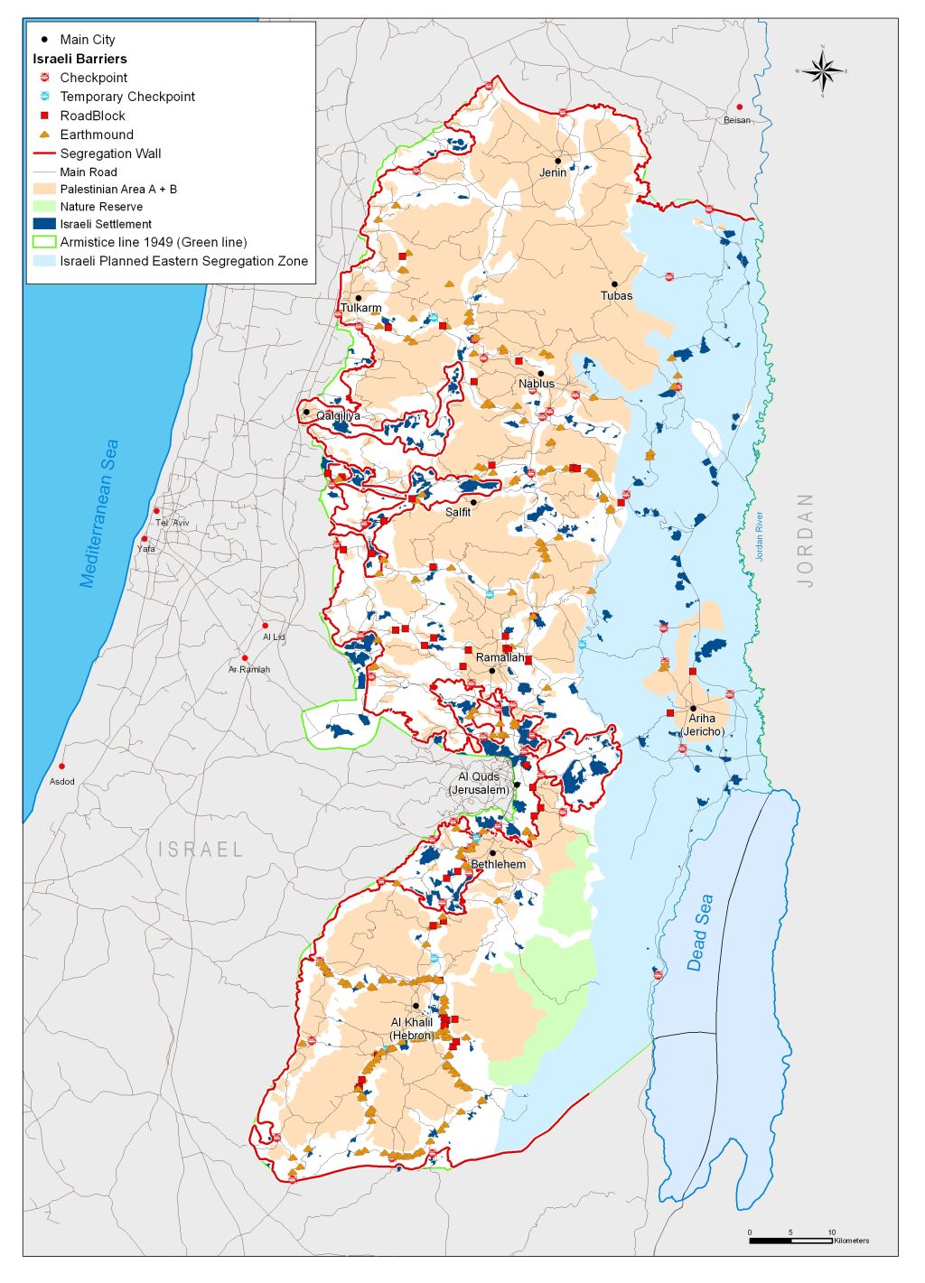 According to the revised plan, the Segregation Wall will run for 703 km in the West Bank.  When complete, the wall will isolate 555 km2 of Palestinian land in the West Bank (approximately 10% of the total area 5661 km2) in the Western Segregation Zone between the wall and the 1949 Armistice Line (Green Line). Israel also maintains an Eastern Segregation Zone stretching over 1664 km2 (29.4% of the West Bank) along the Jordan Valley and the western shores of the Dead Sea.  In total, the Segregation Plan appropriates at least 39.2% of the West Bank.  See Map of the Segregation Wall