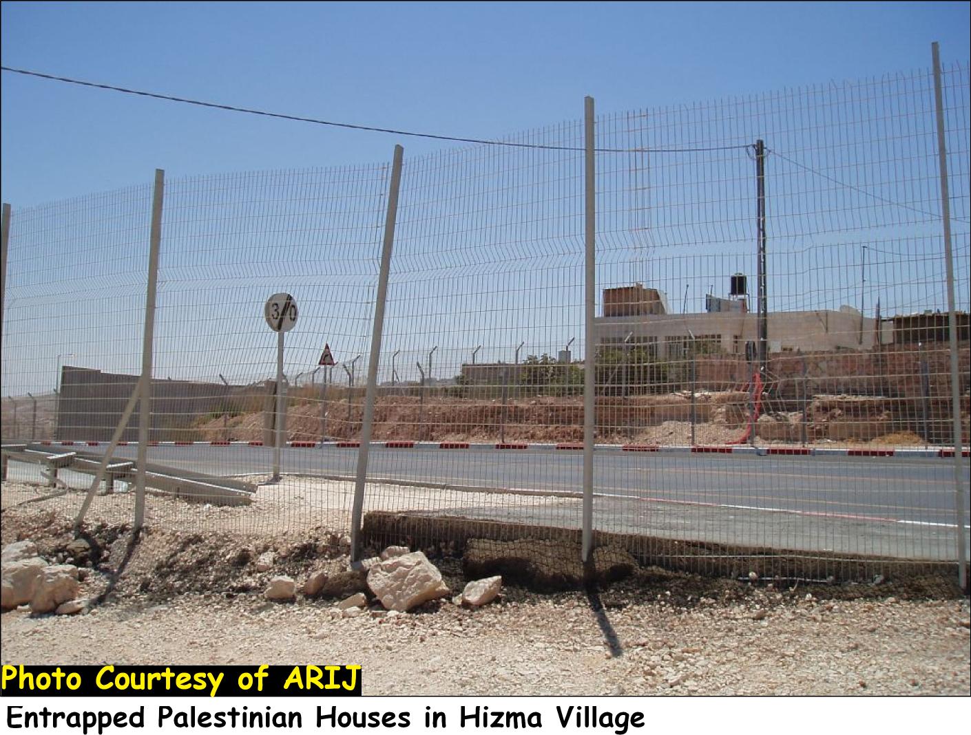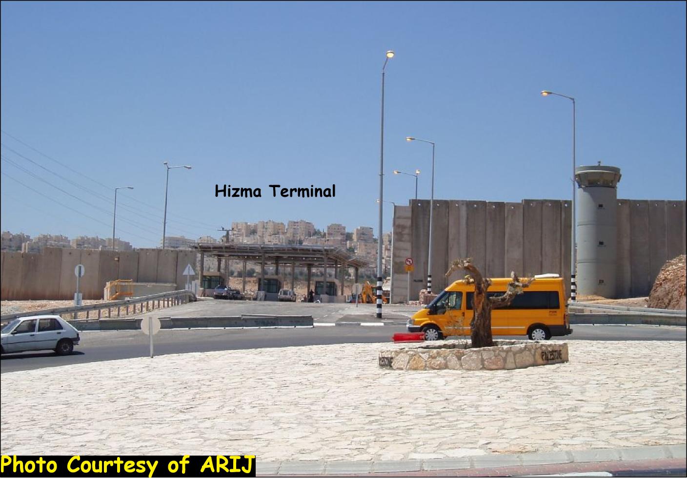 This small Jerusalem suburb is already completely isolated from the rest of the city by a section of the Segregation that cuts through 6kms of village lands. Today, the only opening in 'the ' is a 4 meters wide â??gateâ??, which is blocked by a military checkpoint. Residents who wish to pass through the checkpoint into Jerusalem must acquire a permit from the Israeli ministry of interior, unless they are holders of Israeli identity cards, which allow them to pass the gate. This has created extremely high unemployment in the village, as these permits are not easy, if not impossible to attain. Given that most of Hizma's economic life is directly connected to Jerusalem, this result is not surprising. See Photo 1