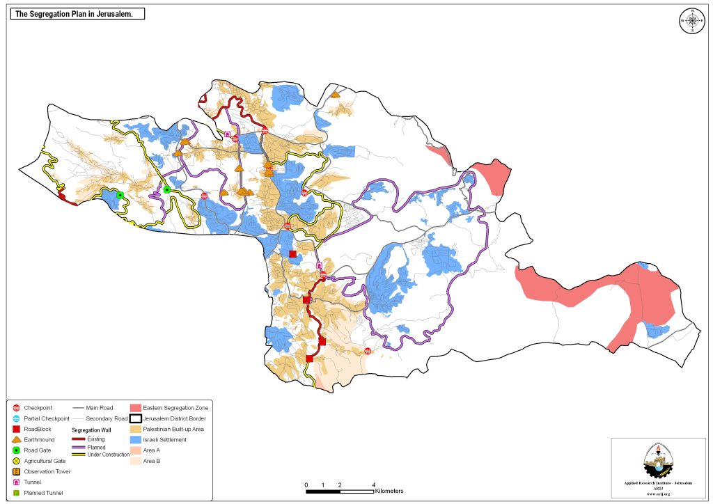 Since East Jerusalem was illegally annexed to Israel and the municipality of West Jerusalem following the 1967 war, Israel has made a concerted effort to colonize all areas of land in East Jerusalem, which were not currently built upon whilst freezing new construction carried out by locals. The desired result is to guarantee a significant Jewish majority in the city by squeezing out the Palestinian residents. It was clear that this plan was in its final stages when the plans for the segregation were announced in 2002. In spite of claims made by the state that the wall was for 'security reasons' its announced path succeeded in slicing through the various neighborhoods of Palestinian East Jerusalem leaving approximately half inside and half outside of the . When complete, the result will be that the municipality will have successfully 'shed' 133,000 Palestinians whilst having confiscated more empty land for colonial expansion. This is a continuation of the 'maximum land minimum Arabs' equation on which Israeli policy has been based since 1947.