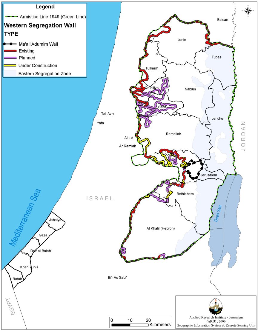 The Israeli Segregation Wall is an Israeli project started as a security pretext to establish a barrier to stop Palestinian resistance from infiltrating into Israel. However, evidence on the ground revealed that Israel is aiming for more than it claims. The route of the Segregation Wall showed that Israel aims to make of it more than a barrier; it is much more like border for the State of Israel. In the process, Israel made sure to include vast areas of land toward the Israeli side with as many settlements as possible and with less Palestinians as possible. For Israeli it is a demographic and geographic challenge. Israel destroyed the Palestinian lands and property, separated and isolated villages from their agricultural lands and from each other, natural resources (specially water resources), is also a an aim of the Israeli Army that made sure to include on the wrong side of the Wall. The vast empty lands were also a target for the Israeli Army, on which more settlements will be built and existing settlements will expand. Simply, the Segregation Wall is the new face of the Illegal permanence of the Israeli Occupation to the Palestinian Territory.