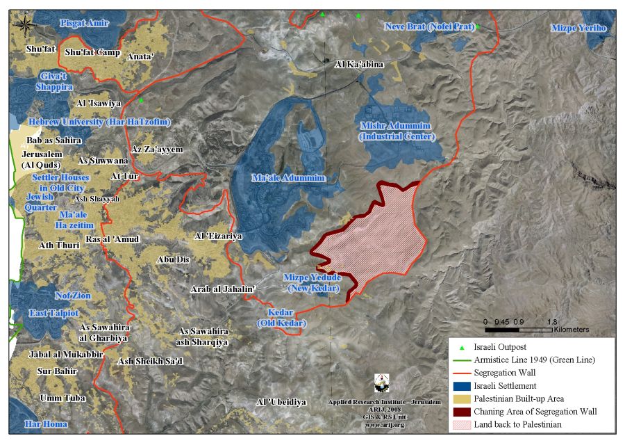 The Israeli state attorney's office announced in August 2008, that in response to court petitions by Palestinian landowners from As- Sawahra shrqyeh village, the state would reroute a section of the segregation wall running east of Maaleh Adumim, restoring Palestinian access to about 4000 Dunums of farming and grazing land which the original plan would have placed on the Israeli side to meet the needs of 84 settler families in new Kedar settlement, also to include an abandoned mosaic. On the other hand, the Defense Department wants to keep this land to meet the expansion and growth aspirations of Maaleh Adumim at the expense of As- Sawahra shrqyeh village. The Israeli state attorney's office annunciation also came after legal battle lasted three years. See Map 2