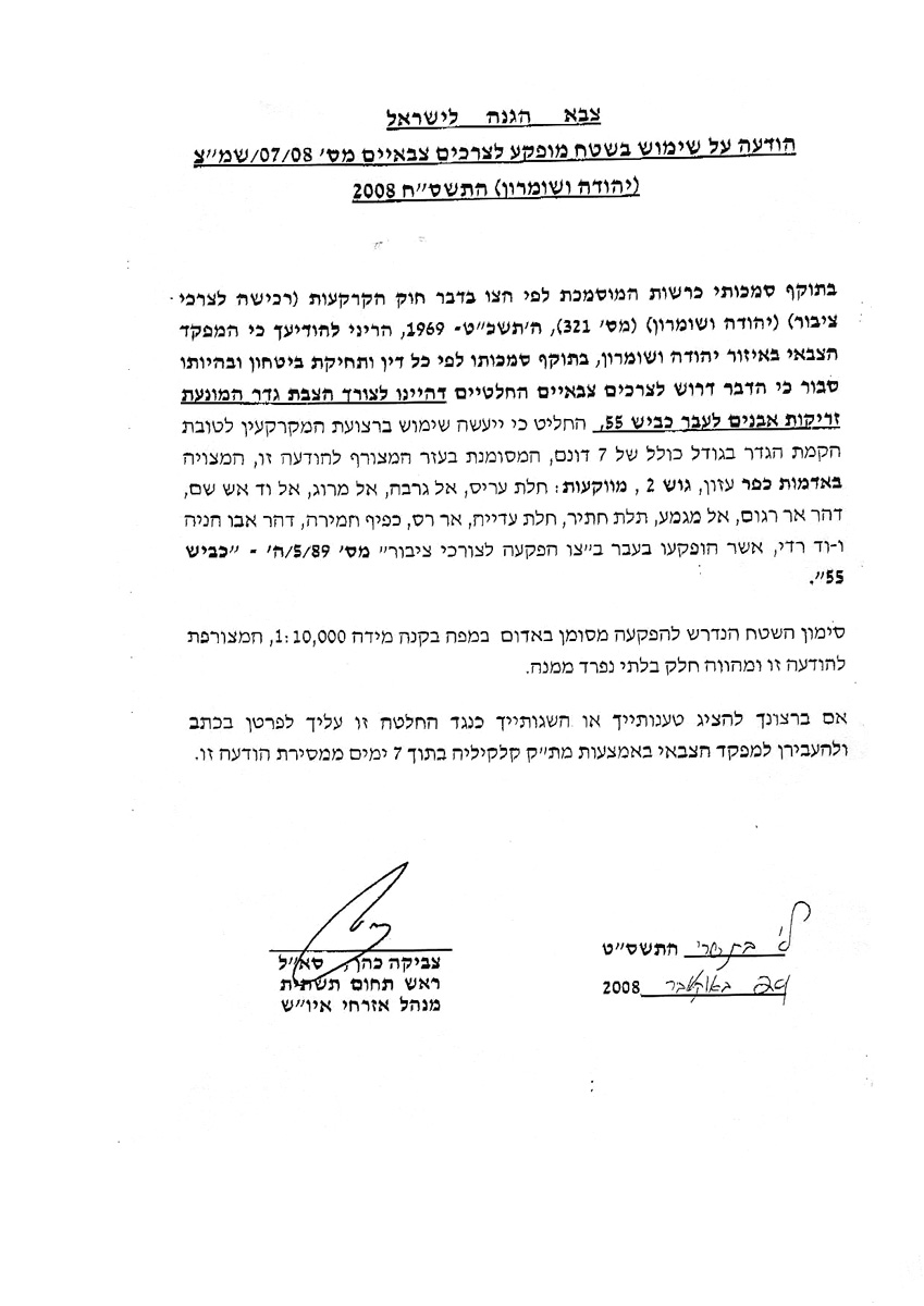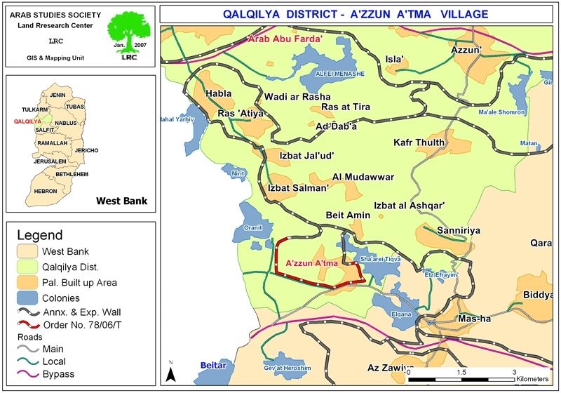 On the 28th of November 2008 a number of Palestinian farmers in the village of Azzun Al Atma were handed Military Order number T/08/06 signed by the head of the Israeli occupation forces in the West Bank. The order called for the re-routing of the Israeli Racist Isolation Wall in the village.