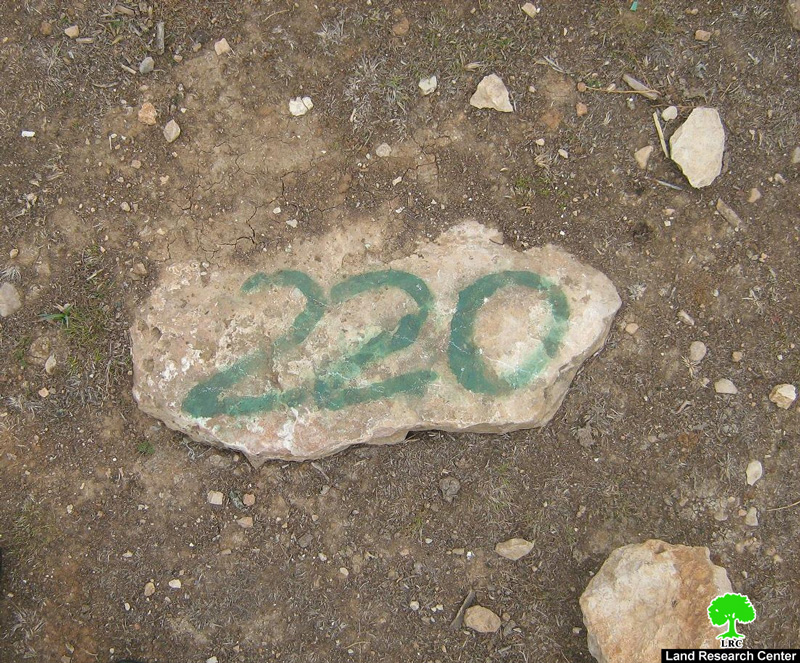 The house of Mr. Suleiman Al Jama’een is the closest house in Al Ramadien to the colony of Ashkolot. He indicated the following to the Land Research Center (LRC)’s field researcher: ' The engineers of the occupation forces placed the marks in my land as a prelude to plowing it. The marks do not match the ones located in the previously-issued military order that confiscated the land in February, 2008. The engineers expanded the targeted areas in an effort to get the Wall as close as possible to our homes as to annex the largest pieces f land possible. '