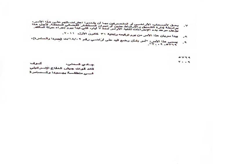On the 25th of July, 2009, the said Committee issued a military order confiscating agricultural lands located near the Racist Isolation Wall east of the village. The stated purpose of the confiscation is to construct a military road running parallel to the Racist Wall.