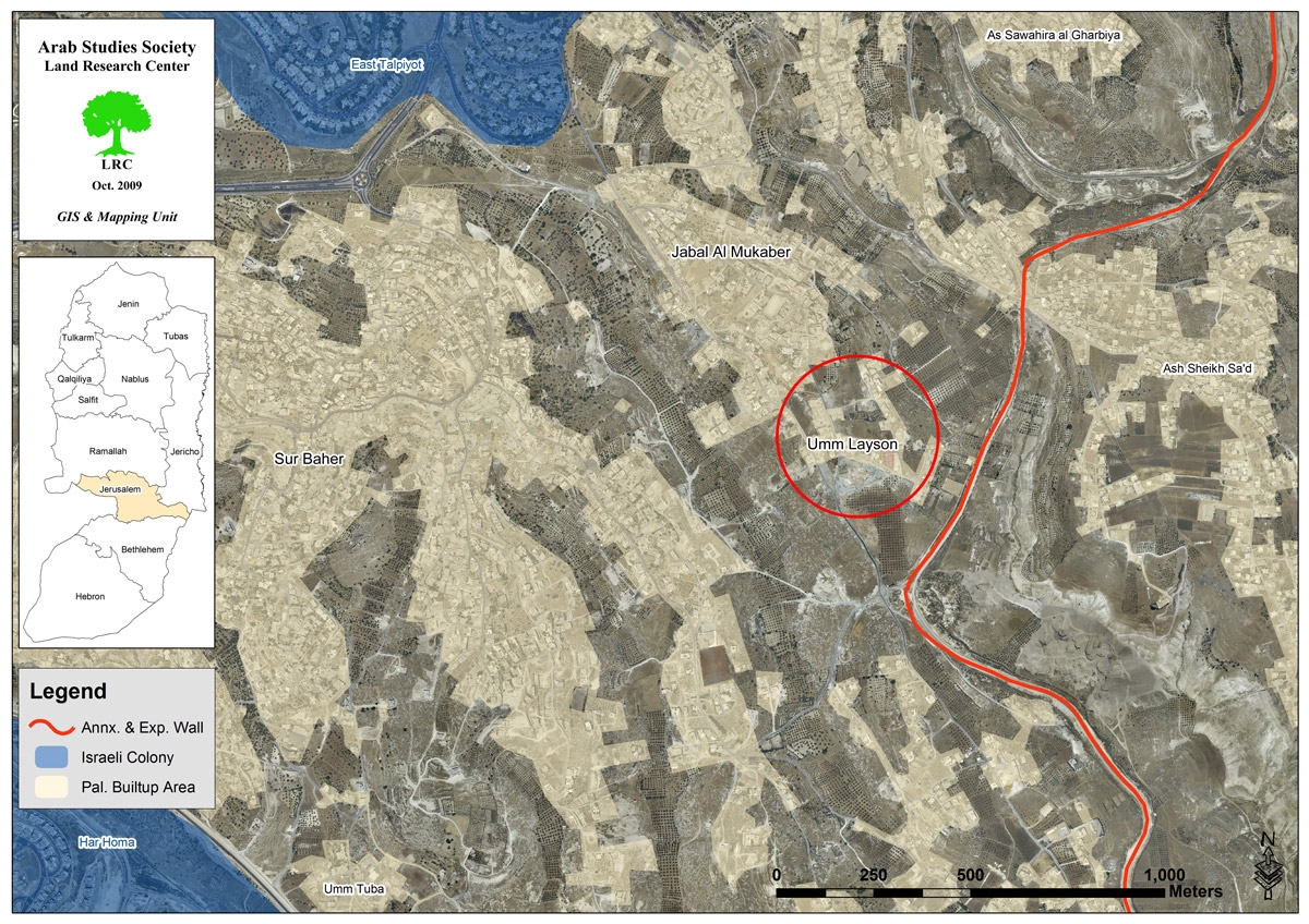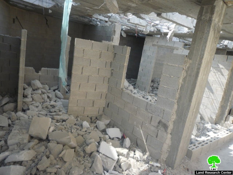 Bulldozers of Jerusalem municipality leveled a house (150 m2) belonged to Ahmad Yosouf Abu Sarhan (52 years) on October 27, 2009. On July 9, 2009, Abu Sarhan started building his house. On august 9, 2009, he received a destruction order that to be carried out within a month from august 15, 2009 or the municipality will destroy the house and remove its remains and make the owner pay for the costs. Abu Sarhan complied with the order by making holes in the walls and ceiling of the house. Nevertheless, it seemed that it was not enough so bulldozers came to the area after the destruction of the building in um Laisoon and leveled the house.