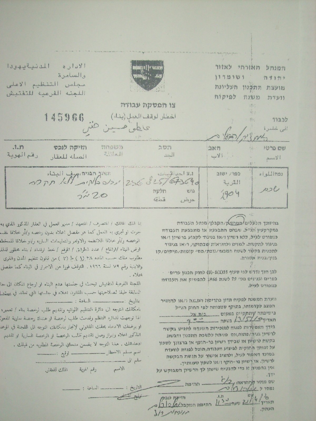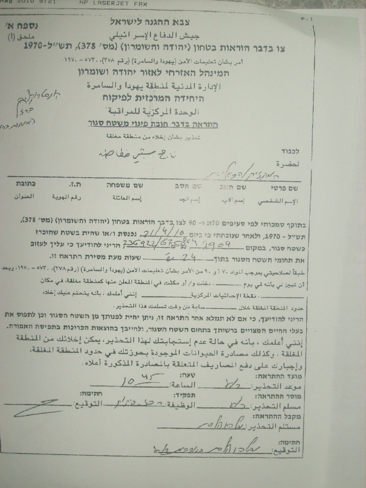 On April 21, 2010, the so-called Construction and Organization Committee issued military orders demanding immediate dismantle of number of the simple structures in Khirbit Tana.