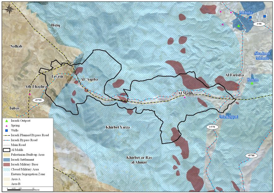 Al- Maleh is a small Palestinian community located to the eastern parts of Tubas Governorates in the northern Jordan Valley. It is bordered by Kardala village from the north, Khirbet Al Ahmar community form the south, AL-Aqaba community from the east , and Al-Farissieh village as well as the Israeli bypassroad #578 from its west. Al- Maleh is populated by 260 residents (PCBS 2010). See Map 1
