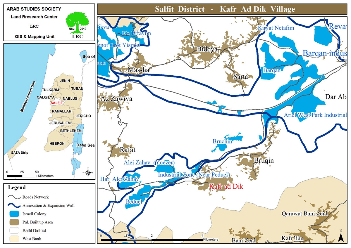 It is bordered by Deir Ballout (west), Bruqin (east), Bidya (north), and Bani Zeid and Deir Ghassan (south). Its total area is 16000 dunums; however, the village has been isolated from its Palestinian surroundings by the Israeli occupation by-pass roads network and three colonies built over its lands. Thus, drastically affecting its organizational plan that used to cover 791 dunums. It must be known that the largest ground water pool is located beneath kafr ad Dik. It is inhabited by 5500 Palestinians, around 1000 households.