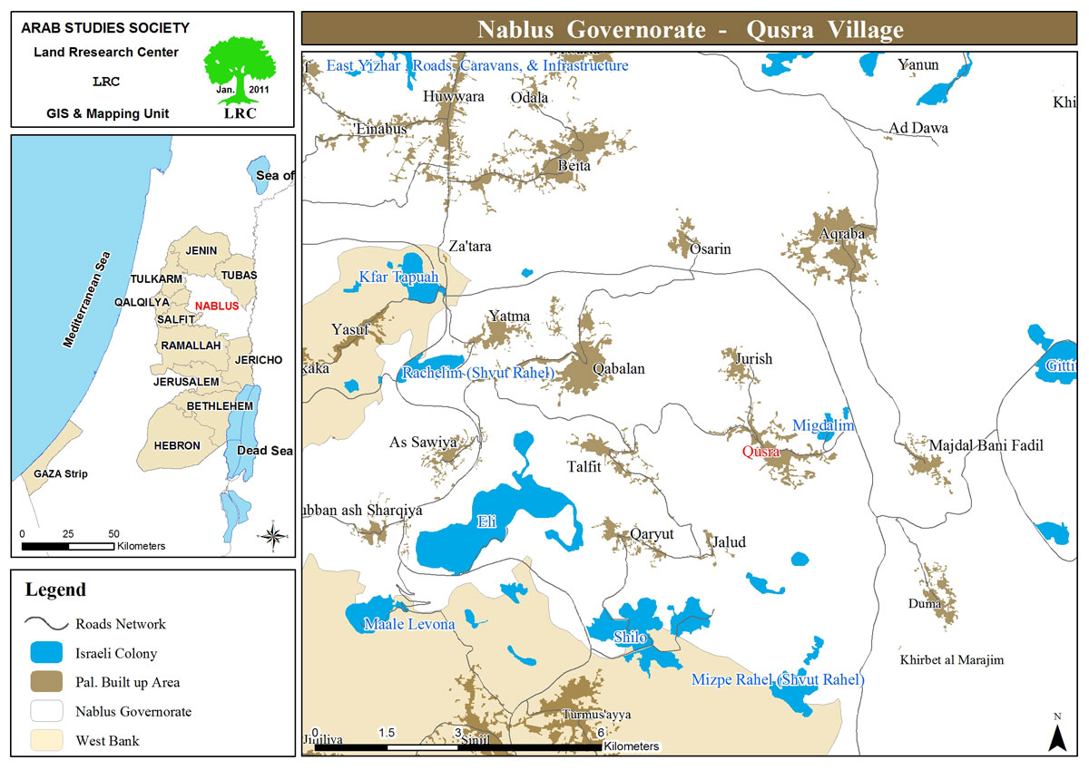Mr. Abdullah Abu Reida, a member of Qasra’s village council, expressed the following to the Land Research center (LRC)’s field researcher: The village of Qasra, like other villages and towns nearby, are targeted by the Israeli occupation; the areas of Baslata and Ras Al Ein which are located east of the village are mainly targeted despite the fact that they are a private Palestinian properties that have been worked on for ages. Yet, despite this fact, the colonists have made it a habit to attack the two locations and to destroy its crops under the watchful eyes of the occupation forces. The colonists establish outposts here and there with no intervention against that from the occupation forces as to create more facts on the ground and to force us to leave our lands and fields.
