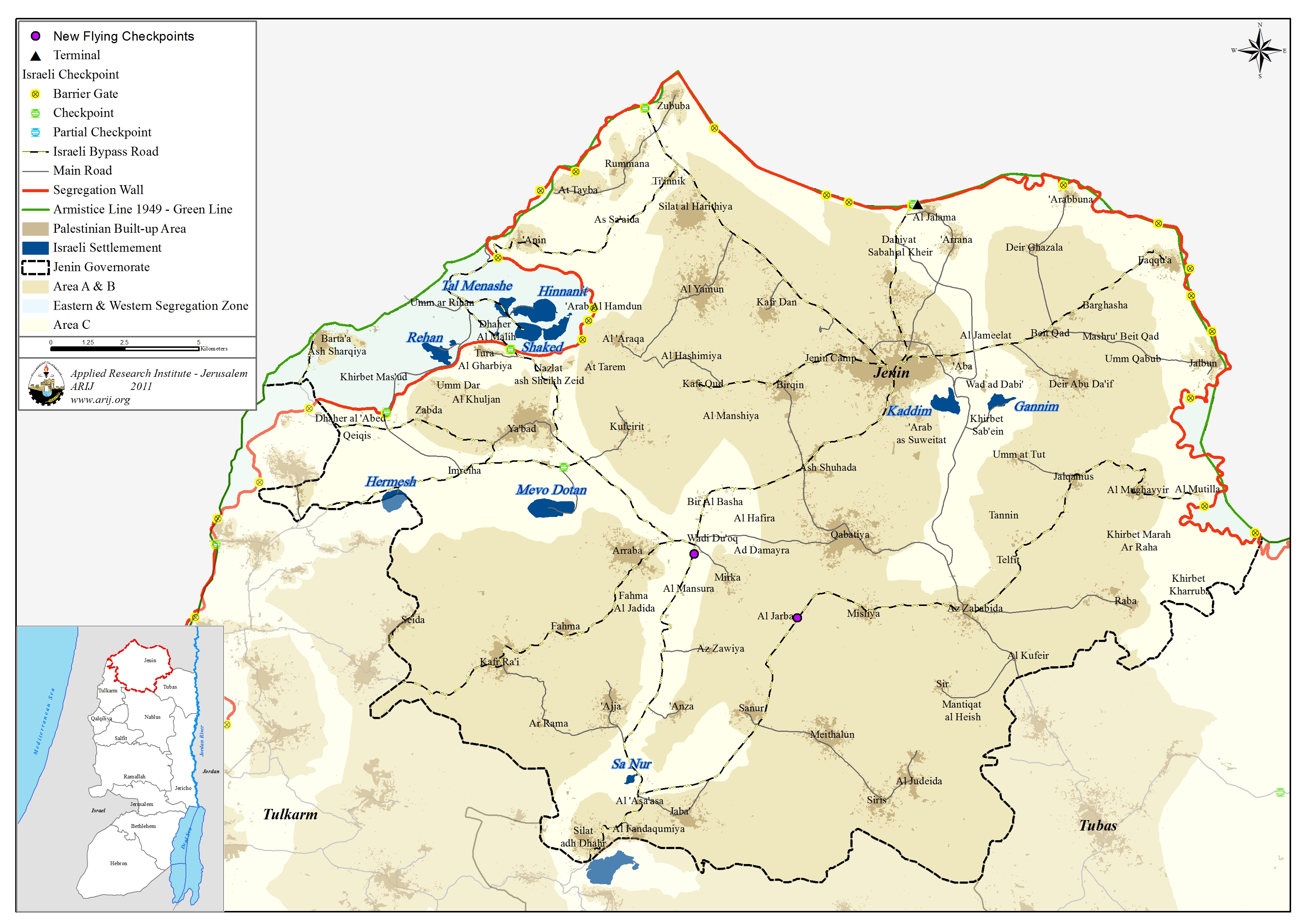 On March 26, 2011, the Israeli occupation Army set up two military flying checkpoints south of Jenin governorate, north of the West Bank. The citizens of Jenin said that the checkpoints were positioned in two areas; the first checkpoint was situated on the Nablus – Jenin Street, near by Al Mansoura village, and the second checkpoint on the crossroad between Qabatya and Sanour villages, in Al Jarba area. On both checkpoints, the Israeli Occupation Army had Palestinian vehicles inspected and stopped for hours. Map 1, shows the location of the new flying checkpoints in Jenin District.