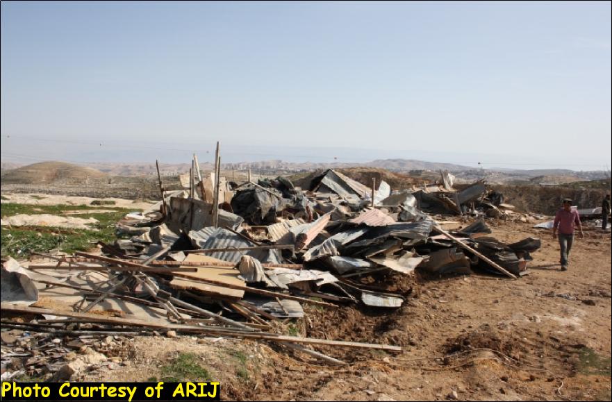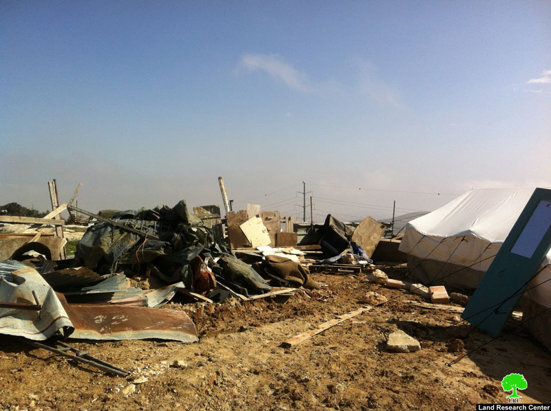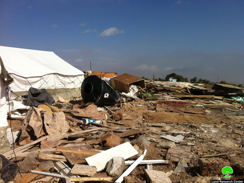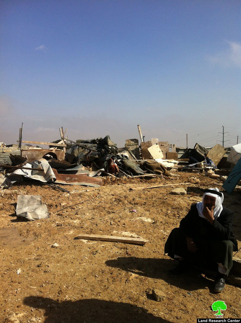 وأفاد المُختار عبد الله سليمان جهالين لباحث مركز أبحاث الأراضي بالتالي: لقد تم إرسال إخطارين بالهدم في تاريخ 23.07.2011 وآخر في تاريخ 23.10.2011 لهدم المساكن التي هي مأوانا الوحيد، فنحن نُقيم هُنا من قبل العام 1967 بعد ترحيلنا في أكثر من مكان مُنذُ أن تم طردنا من موطننا الأول بئر السبع عام 1954 بعد النكبة. وعند الساعة 11:00 ليلاً، حضر حوالي 200 جندي مُقنعين وأكثر من 10 سيارات عسكرية ومعهم جرافتبن، وقاموا بتجريف المساكن وهدمها، هذا وقد تم الاعتداء على السيد يوسف محمد جهالين بعد أن حاول الدخول إلى مسكنه، فقاموا بضربه، واستمر الهدم حتى الساعة الثانية فجراً.ويُضيف المُختار قائلاً: قُلت للضابط الذي تواجد معهم: ماذا تُريدون؟ لقد طردتمونا من أرضنا في النقب ولاحقتمونا، والآن تهدمون مساكننا ؟ ماذا تًريدون ؟ فأجابني وهو يُشير إلى المُعسكر المقابل لنا والذي يبعد أقل من 500 متر عن المساكن : أنا أجلس هُناك ، وباختصار مظهرك لا يُعجبني حين أطل من النافذة، اذهبوا إلى رام الله، هُنا ليس لكم مكان .