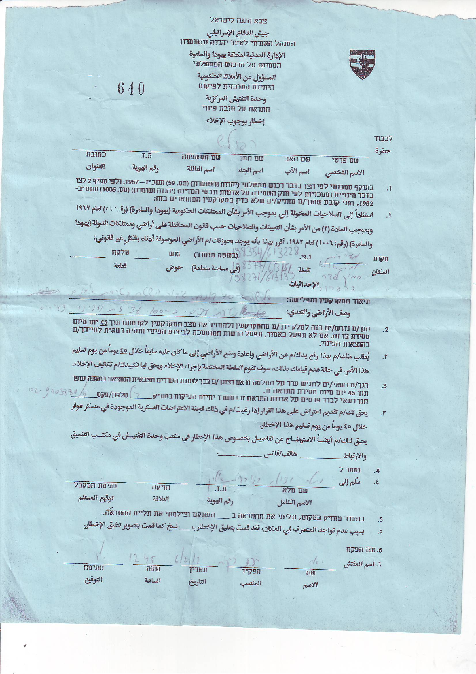 2- خالد محمد خليل إبراهيم، حيث تلقى إخطاراً بإخلاء نحو 6.5 دونمات، وكان قد عمل على استصلاحها قبل نحو شهرين وهي مزروعة بنحو 200 شجرة زيتون وبعض أشجار العنب، ومحاطة بالسلاسل الحجرية على الأطراف.