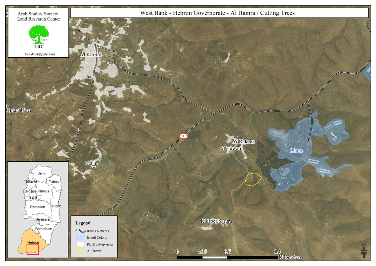 أقدم مستعمرون من مستعمرة ‘ ماعون ‘ بتاريخ 13/5/2012 على تقطيع ( 20 ) شجرة زيتون في منطقة ‘ الحُمرا ‘ التابعة لقرية التواني جنوب بلدة يطا بمحافظة الخليل.