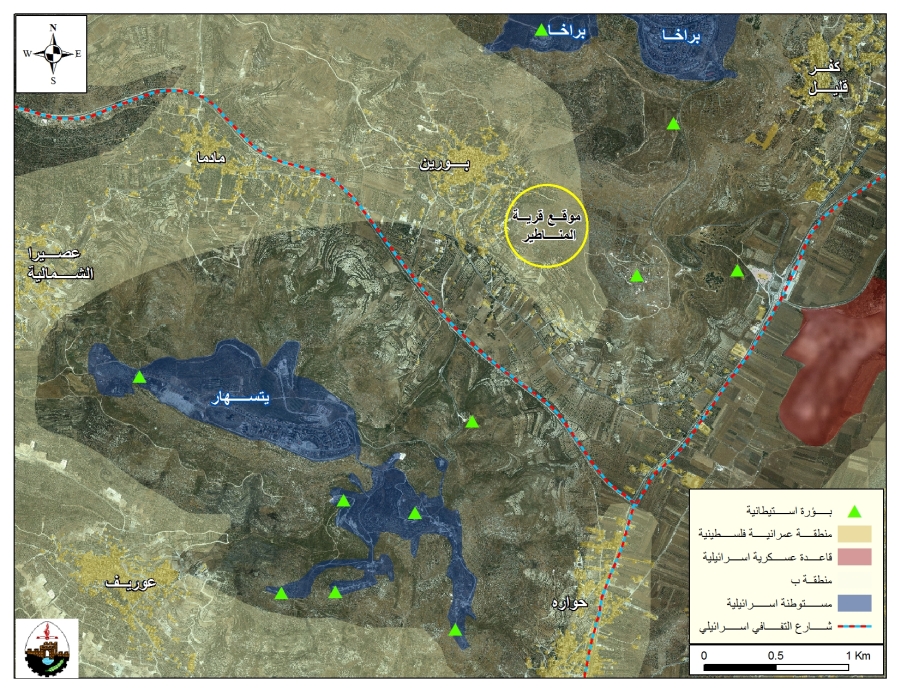 On the 2nd of February 2013, a group of Palestinians established a new village called “Al-Manateer” on lands of Burin village south of Nablus city and set up a number of tents and structures in the area. The new village was established to protest against the Israeli occupation authorities' measures that aim at hindering Palestinians of Burin village from reaching this spot of land for security considerations and preventing Palestinian land owners from utilizing these lands as should, and against the Israeli settlements expansions which are taking place on lands of the village and the constant Israeli settlers' attacks which are costing Palestinian farmers in Burin village a huge loss since they target the agricultural sector in the village which is the main source of livelihood for most Palestinian families.
