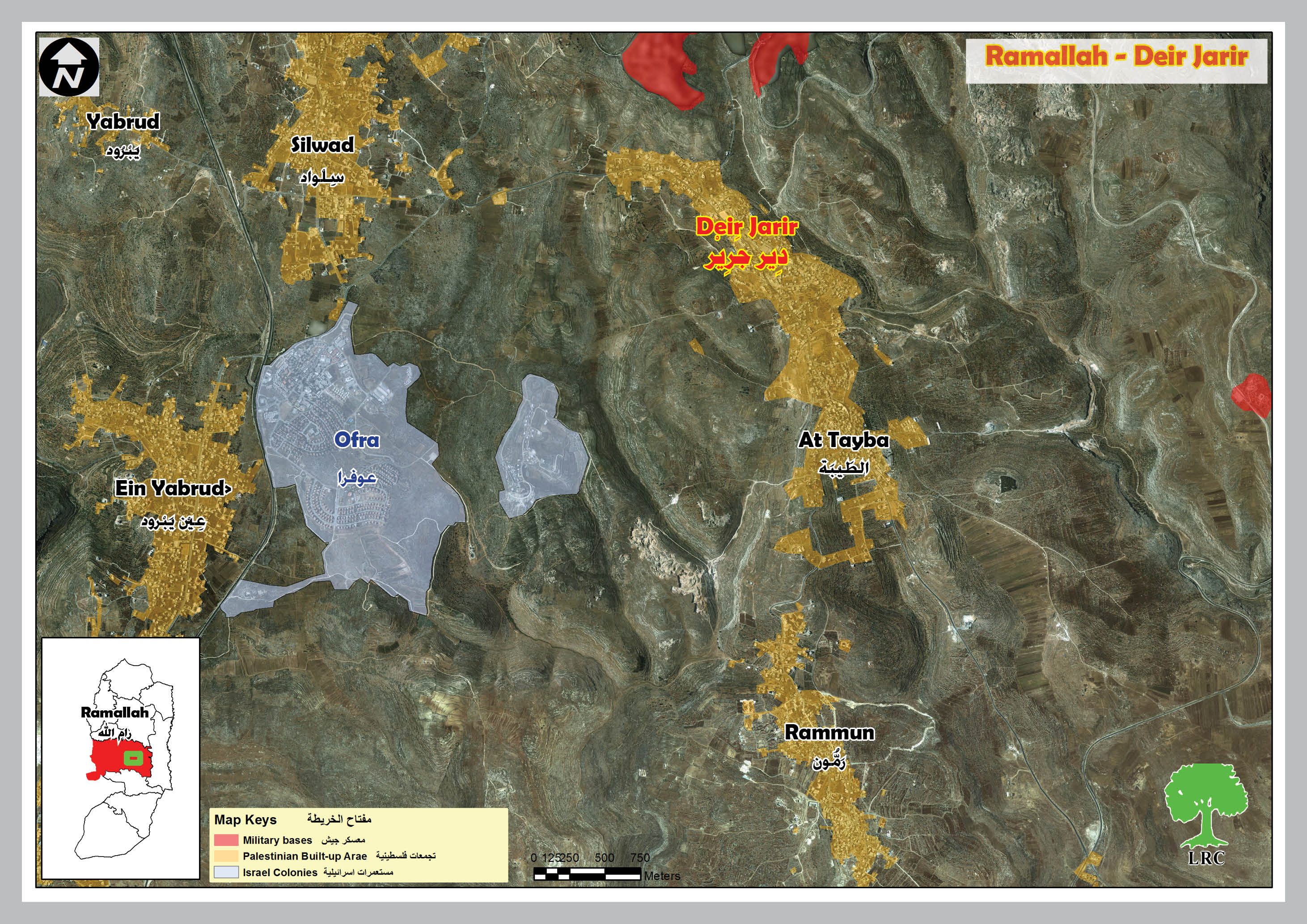 Located 12 km to the northeast of Ramallah city, Deir Jarir is surrounded by Al Mazra'a Ash Sharqiya and Kafr Malik (north), Silwad (west), Kokhav Hashahar colony (east), and At Tayba village (south).