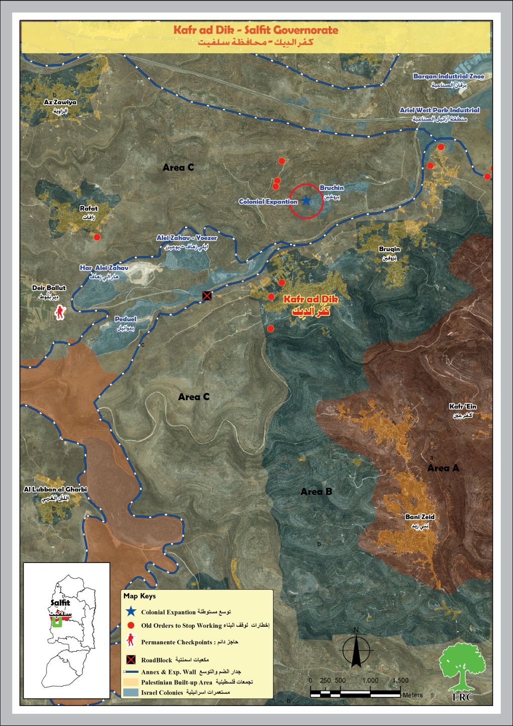 أكد السيد نافز بركات لباحث مركز أبحاث الأراضي: " انه تم تقديم اعتراض على المخطط الهيكلي المزعوم الذي يخطط الاحتلال تنفيذه بهدف توسعة مستعمرة " بروخين" على حساب المزارعين في البلدة و البلدات المجاورة وذلك من خلال المحامي يوسف جبارين بالتنسيق مع الدائرة القانونية في محافظة سلفيت، إلا أن الاحتلال كالعادة ما زال يماطل في اتخاذ أي قرار يدين المستعمرين وما تسمى لجنة التنظيم العليا الإسرائيلية، التي تصادر الأرض وتوسع الاستيطان عليها، بغير وجه حق".