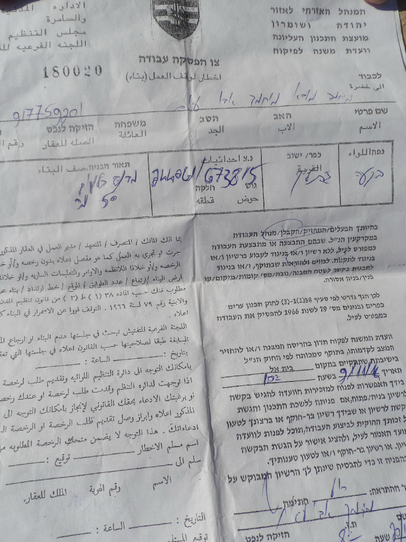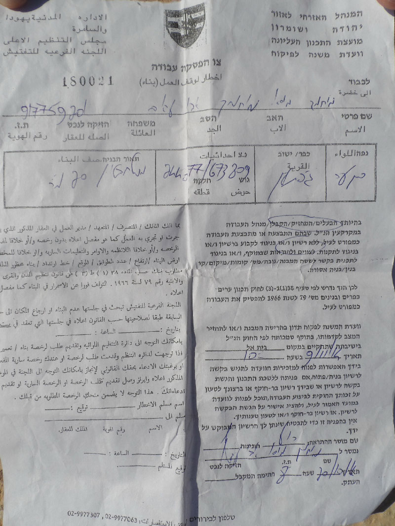 According to the military orders, the citizen was given until October 9th 2014 as a final date to complete all licensing procedures. This comes in time with the session of the Planning Committee in the court of Beit El to consider the status of the structures.