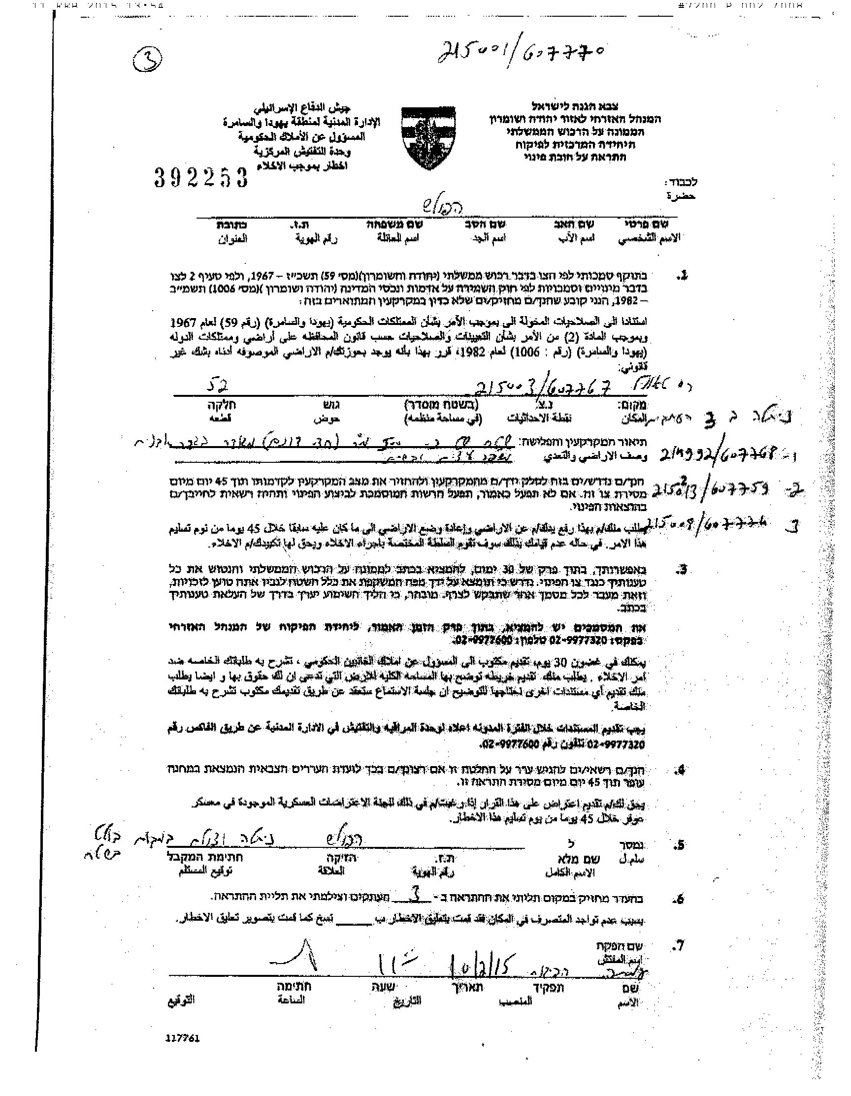 The custodian of State Property: “According to the powers assigned to me concerning State Property (Judea & Samaria) (No. 59) of 1967 and under Article (2) of Ordinance and powers according to State Law of land and property (Judea and Samaria) (No: 1006) of 1982, I acknowledge that the described land below is illegally owned by You. |