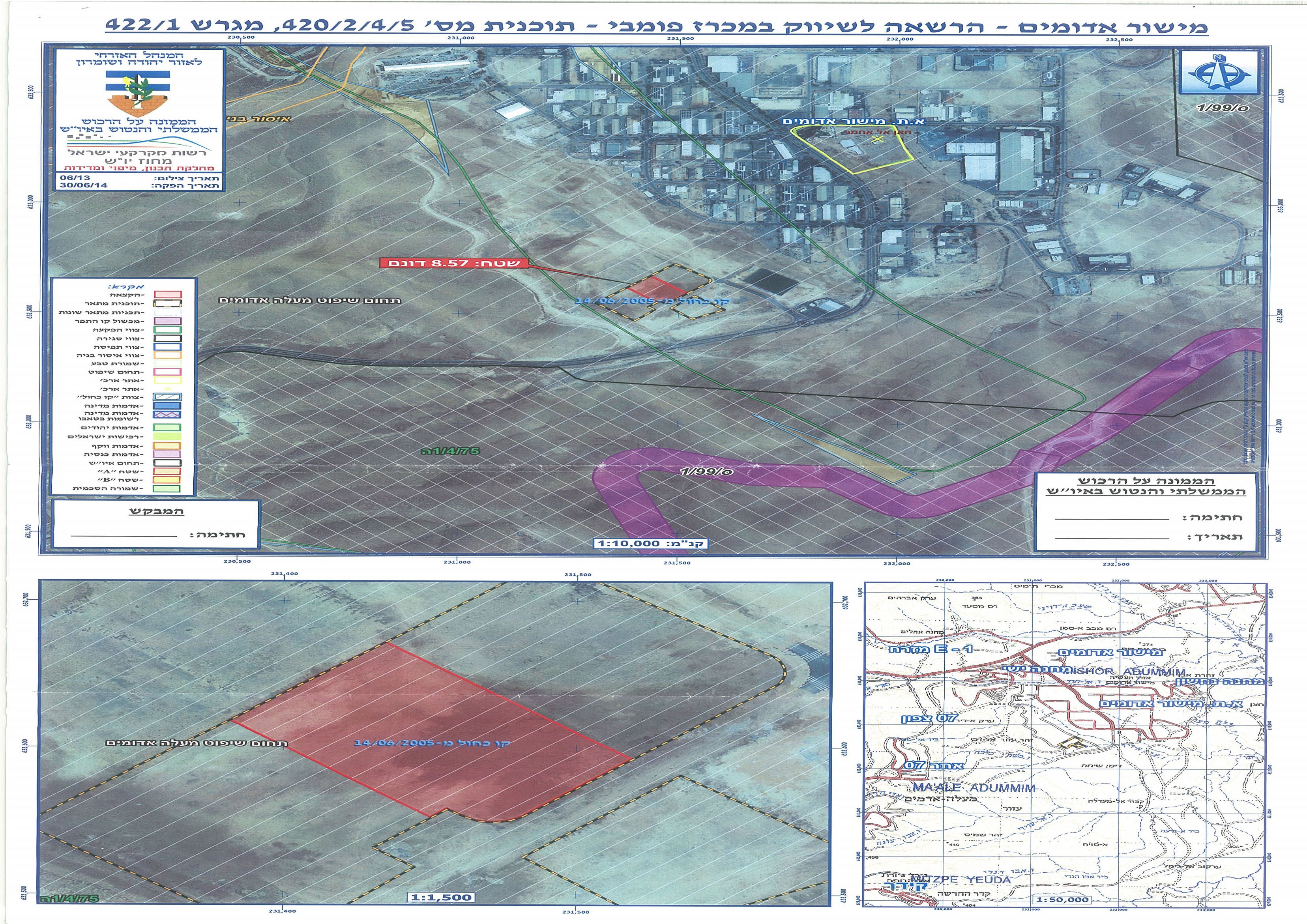 In the Ma’ale Adumim settlement, the Custodian of Israeli Government Property in the occupied West Bank issued tender No. 84/2015 inviting proposals for signing a lease to a contract for 49 years, including an option to extend for another 49 years, to lease four plots of land for commerce and other services in Ma’ale Adumim settlement east of Jerusalem city. The tender includes four previously issued tenders published on January 23, 2015 in Ma’ale Adumim settlement, 10/2015, 11/2015, 12/2015 and 13/2015. The four plots of land fall within plan No. 420/2/4/5 and the deadline for submitting bids is September 7, 2015. See Map 3