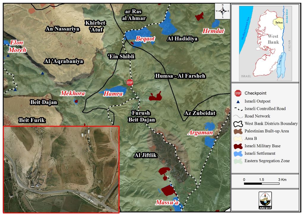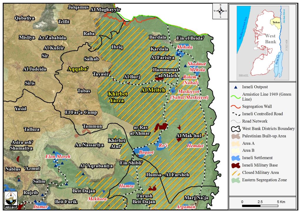 After the Israeli Authorities occupied the West Bank in the 1967, they declared all the area along the eastern part of West Bank as “closed military zone” and it occupied about 29.3% of the total area of the West Bank. Accordingly the construction are not allowed in these area and of course for the Palestinians only. About 44 Palestinian communities living there (pop. exceeds 60000 Palestinian residents), however there are 37 Israeli settlements and 32 outposts, in addition to a number of military bases and an Israeli road networks.
