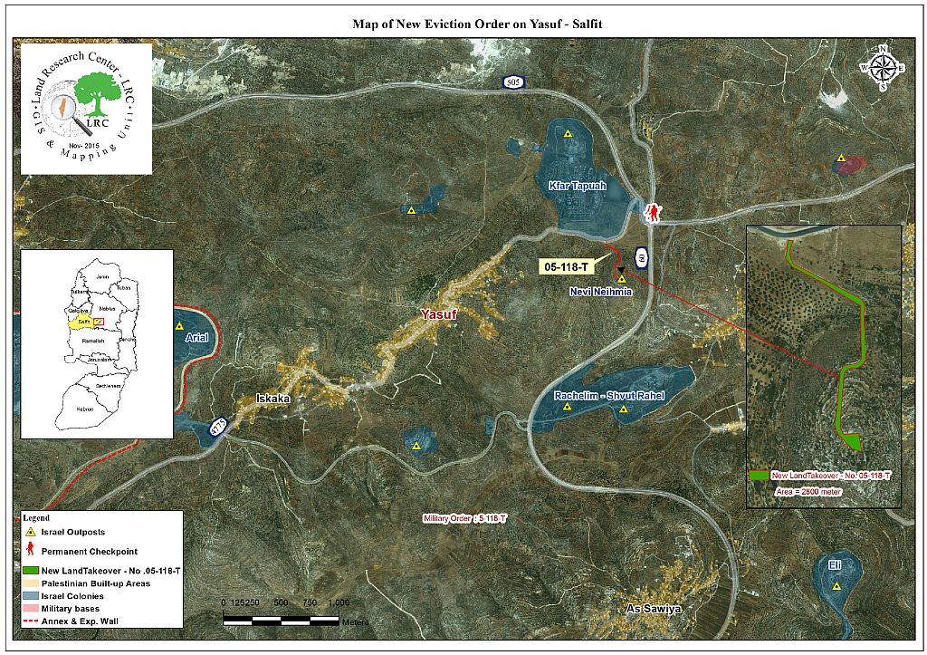 The commander of the army in the West Bank Roni Alof issued on October 20, 2015 a military order to extend the validity of a land grab order. The order mentioned the confiscation of 2.78 dunums from the villages of Yasuf and Al-Sawiya, south Nablus. It also included a validity extension of a land grab; the targeted area totals 2.219 dunums and the extension will last until 2017.