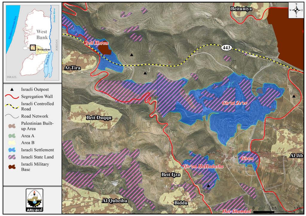 According to an analysis conducted by the GIS department in the Applied Research Institute – Jerusalem (ARIJ), showed that not only the synagogue was built on private Palestinian land, but also dozens of housing units and buildings constructed in the Israeli settlement of Giva’at Ze’ev on Palestinian private owned lands. See the map No.1
