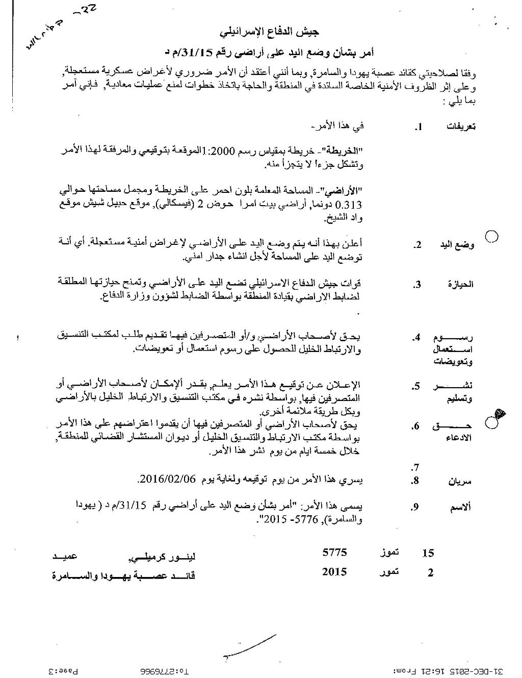 الخارطة رقم 1: أمر بشأن وضع اليد على أراضي رقم 15/31/م د (يهودا والسامرة), 5776-2015