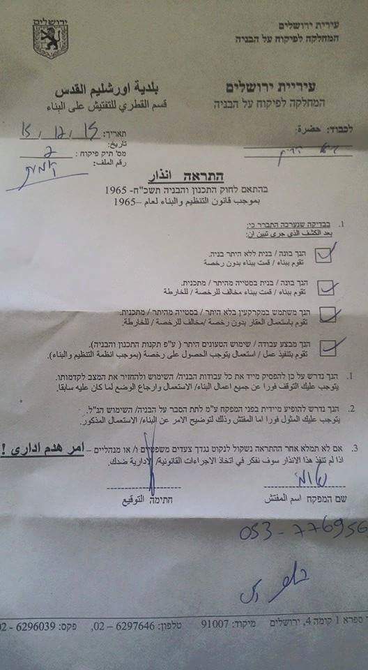 According to the Israeli orders, the Israeli Authorities informed the owners of the building, that the building were built without a permit from the Israeli Municipality of Jerusalem, and they must stop any construction in the building, and to submit for a license otherwise Their building will be demolished.
